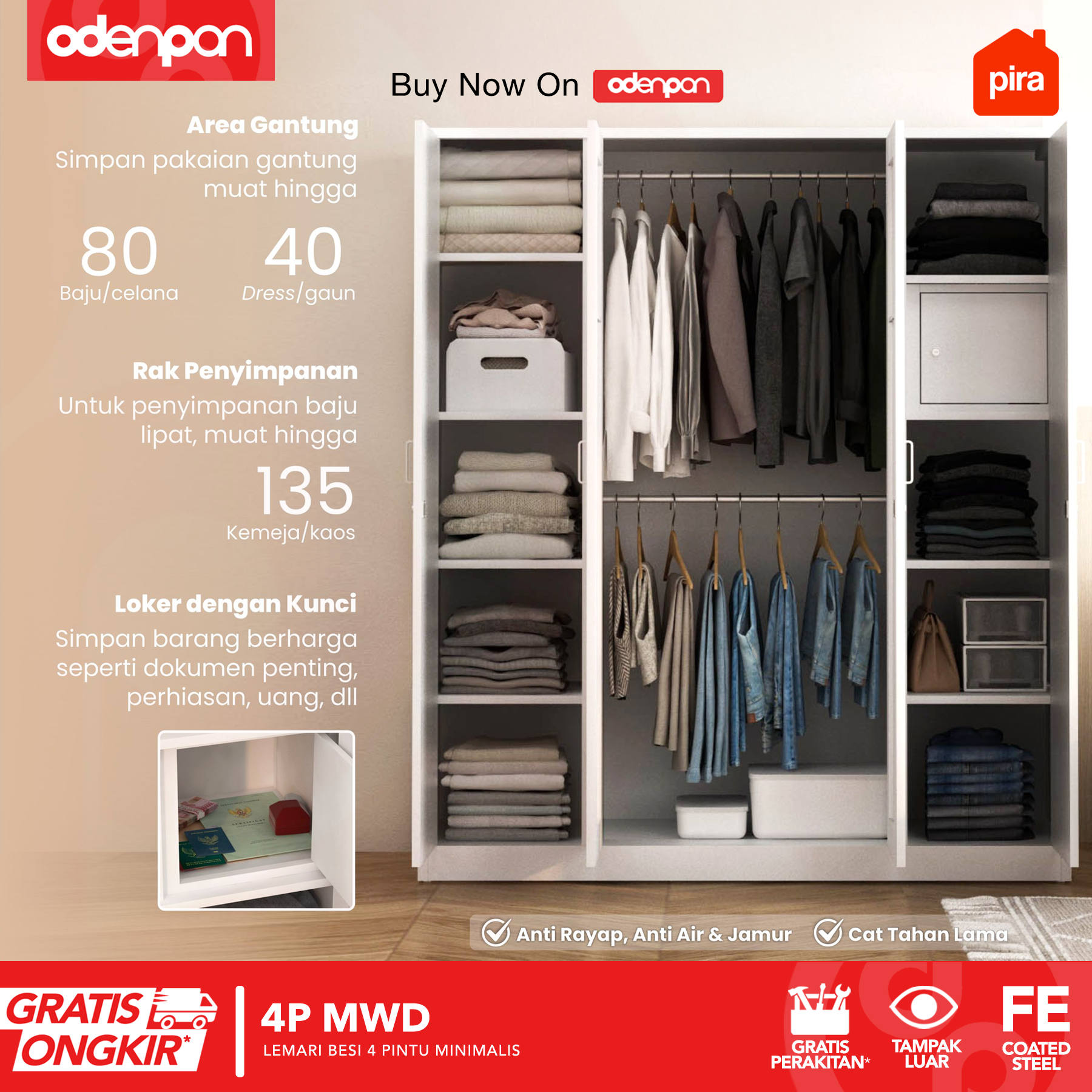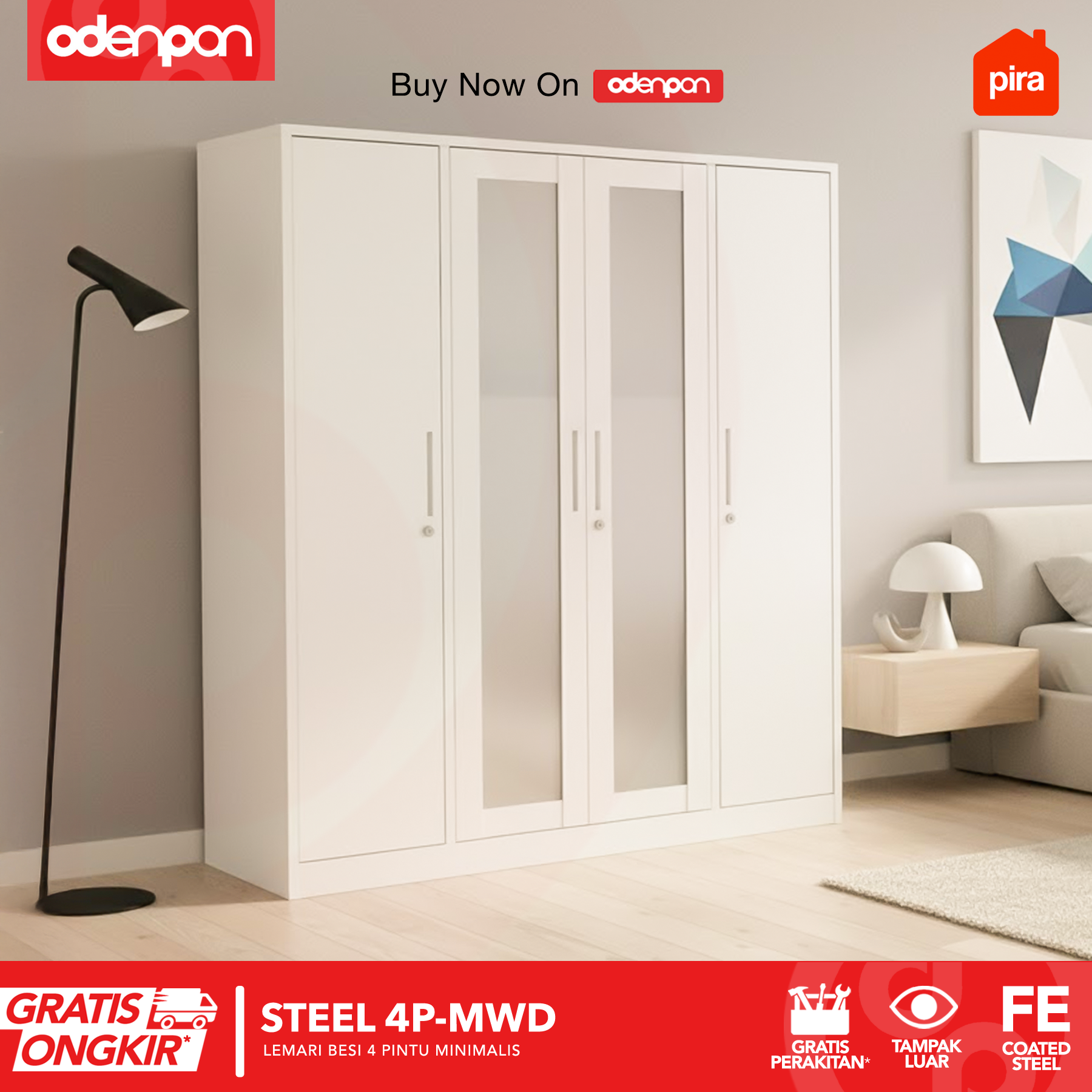 PIRA - 4P MWD Lemari Pakaian Baju 4 Pintu Besi 2 Cermin Minimalis Jumbo